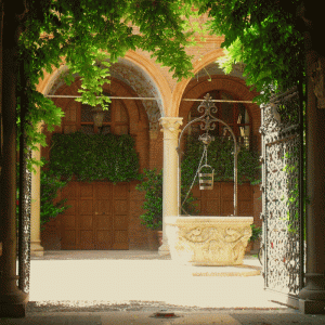 Leggi tutto Nel cortile principale spiccano l’antica vera da pozzo in marmo di Verona; la lanterna e il cancello in ferro battuto dell’artista reggiano Giuseppe Bagni; una loggia cassettonata con modulo superiore dimezzato. All’interno, lo scalone principale presenta un soffitto decorato da un dipinto ottocentesco raffigurante l’“Aurora sul cocchio”, con putti e volute vegetali. Riduci